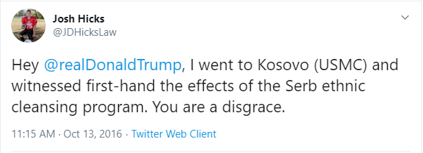 o In an Oct. 13, 2016, tweet, Josh Hicks wrote, “Hey @realDonaldTrump, I went to Kosovo (USMC) and witnessed first-hand the effects of the Serb ethnic cleansing program. You are a disgrace.”[1]