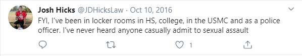o In an Oct. 10, 2016, tweet, Josh Hicks wrote, “FYI, I’ve been in locker rooms in HS, college, in the USMC and as a police officer. I’ve never heard anyone casually admit to sexual assault.”[1]