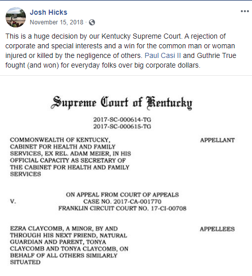 o In a Nov. 15, 2018, Facebook post, Josh Hicks wrote, “This is a huge decision by our Kentucky Supreme Court. A rejection of corporate and special interests and a win for the common man or woman injured or killed by the negligence of others. Paul Casi II and Guthrie True fought (and won) for everyday folks over big corporate dollars.”[1]