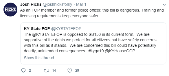 o On March 1, 2019, Josh Hicks replied to a tweet regarding the Kentucky Federation of Police’s opposition to SB 150. In his tweet, Josh Hicks wrote, “As an FOP member and former police officer, this bill is dangerous. Training and licensing requirements keep everyone safer.”[1]
