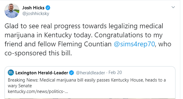 o On Feb. 20, 2020, Josh Hicks tweeted, “Glad to see real progress towards legalizing medical marijuana in Kentucky today. Congratulations to my friend and fellow Fleming Countian @sims4rep70, who co-sponsored this bill.”[1]
