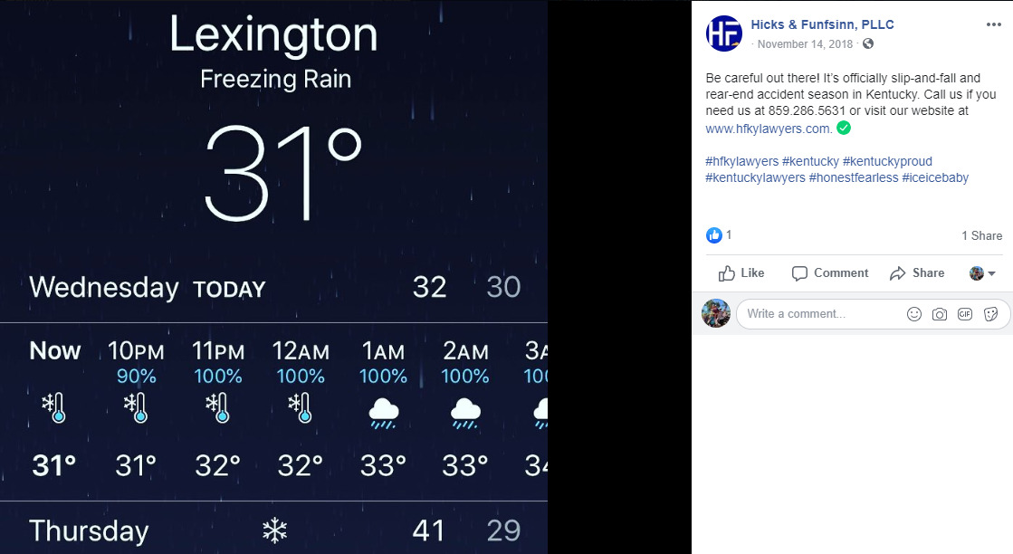 According to a Nov. 14, 2018, Facebook post on the Hicks & Funfsinn website, “Be careful out there! It’s officially slip-and-fall and rear-end accident season in Kentucky. Call us if you need us at 859.286.5631 or visit our website at www.hfkylawyers.com.”[1]